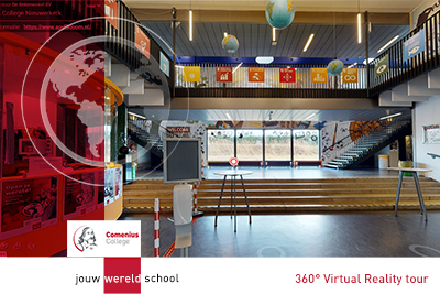 U kunt virtueel door de school heen wandelen door op onderstaande afbeelding te klikken. Het gebruik van een VR-bril is mogelijk, maar niet noodzakelijk om virtueel 3D door de school te wandelen. De groene aanwijzers in de tour verwijzen naar een lokatie waar een filmpje te zien is. Door op de rode aanzijzer te staan kunt u het filmje bekijken.