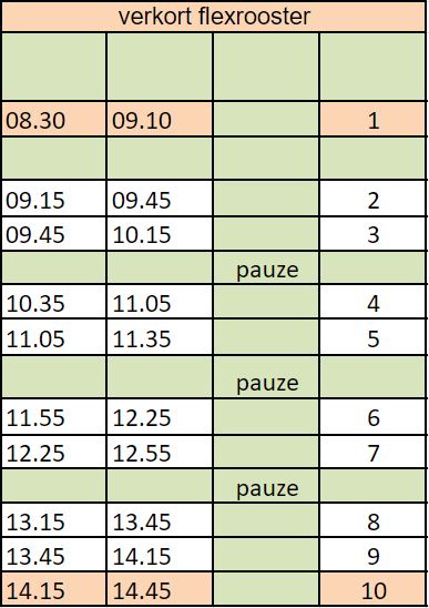 Hieronder zie je de tijden van het verkorte flexrooster. Dat rooster wordt soms gebruikt als er 's middags een vergadering of iets dergelijks is.